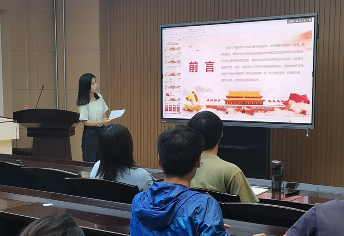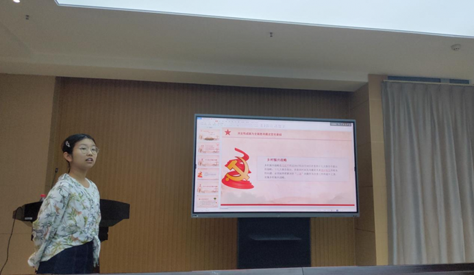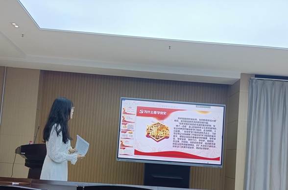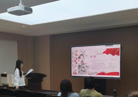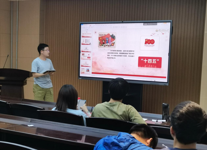 段梦园同学主讲的题目是“党的诞生与青年觉醒”,1921年7月23日,广为人知的红船的故事,党的一大宣告中国共产党成立,从此中国出现了以马克思列宁主义为行动指南的统一的无产阶级政党。这是中国历史上开天辟地的大事变。其他的主义都没走通,只有中国共产党领导的革命事业成功了,这说明中国共产党代表了人民的意愿和心声,顺应了历史的规律。先进青年在探索救国道路上必然选择中国共产党!回顾百年党史,青年引领时代,时代成就青年。前有先辈筚路蓝缕奠基立业,今有吾辈矢志践行初心使命。今日之责任,不在他人,而全在我青年。“两千五百年不变的车辙如何去面对船坚炮利,只有一条路——觉醒”。