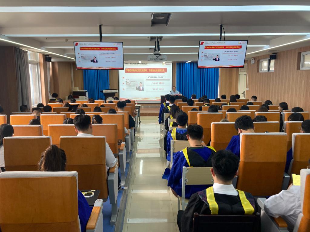 在人才培养过程中牢牢把握社会主义办学方向,坚持为党育人、为国育才,牢记“国之大者”,胸怀“两个大局”为国家建设和民族复兴源源不断提供高素质人才。四是不负韶华勇担当,他引用习近平总书记在五四青年节上的重要讲话,并提到黄文秀,北斗年轻研发团队等,讲述他们用美好青春诠释共产党人使命。最后,于军琪强调,青年崇廉尚洁、严以律己,国家就能正气充盈、永葆青春活力,希望大家深刻地感受习近平新时代中国特色社会主义思想的伟力,更加清晰地把握党的纪律要求,以更高标准更严要求规范自身行为,不断提高党性修养和专业素养,做一名廉洁修身的新时代青年。