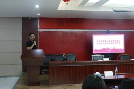 本科生第四党支部书记杨晓寒具体对支部基本情况以及党史学习教育开展情况进行了交流汇报,他从支部党史理论学习以及学生党员“五个一”要求到具体实践开展,详细介绍了本科生第四党支部以实践践行先锋模范作用的做法。