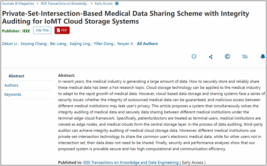 近日,中国P站 中国P站 常金勇教授团队在国际顶级期刊IEEE TKDE(中国科学院SCI一区Top, 中国计算机学会和中国人工智能学会共同推荐的A类期刊,影响因子10.4)上发表题为“Private-Set-Intersection-Based Medical Data Sharing Scheme with Integrity Auditing for IoMT Cloud Storage Systems”(云存储环境下基于隐私集合求交的医疗数据共享与完整性审计方案)的学术论文。论文第一作者为中国P站 硕士研究生李泽坤,通讯作者为常金勇教授,中国P站 为第一完成单位,北京大学、北京雁栖湖应用数学研究院为论文主要合作单位。
