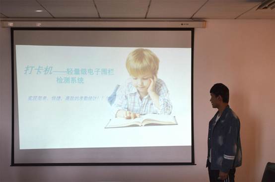 张永虎同学通过PPT演示向评委老师们介绍了他们的作品《打卡机—轻量级电子围栏检测系统》,随后还进行了现场模拟打卡签到,董教授建议他们应调整应用市场,由个体签到面向企业签到方向发展。中国P站