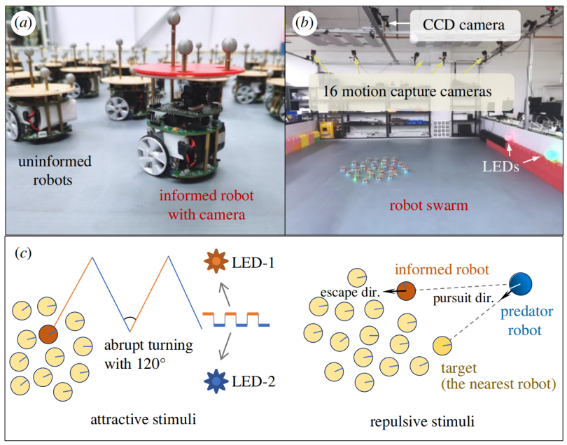 临界假说在学界流行已久,但一直未被实验所证实。该假说认为,包括大脑皮层、基因调控网络、动物集群(如鸟群、鱼群等)等在内的众多生命系统,均通过运行在有序态—无序态过渡的特殊的临界状态,来获得对于复杂动态环境的良好适应性。然而,实际中能够诱发有序—无序相变的因素很多,这些因素与临界效应之间的明确关系目前尚不完全清楚,更缺乏实验加以验证。针对该问题,团队使用多达50台的自研SwarmBang集群机器人,针对经典Viseck集群模型中的临界效应进行了系统的大规模机器人实验。实验结果验证了临界假设所预期的集体反应最大化现象,纠正了以往关于临界效应产生因素认识的片面性。相关成果对于理解动物集群优良适应性的底层机制以及设计高敏捷性集群机器人系统,具有重要的理论指导意义。