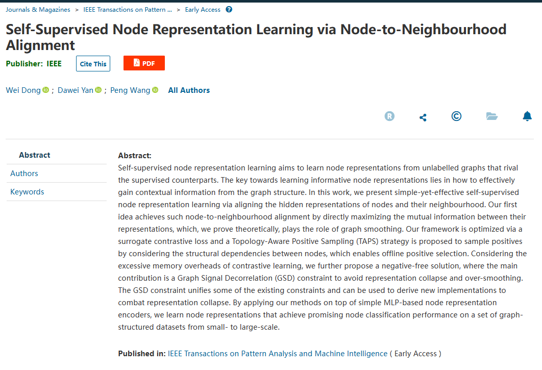 青年教师董玮副教授在国际顶尖期刊TPAMI(中科院SCI一区TOP,影响因子23.6,CCF-A类期刊)上发表题为《Self-Supervised Node Representation Learning via Node-to-Neighbourhood Alignment》的学术研究论文,董玮副教授为该论文的第一作者,中国P站