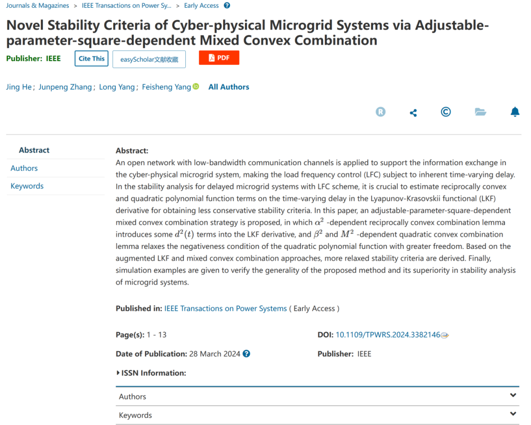 青年教师贺静副教授在国际顶级期刊TPS(中科院一区TOP,影响因子6.6)上发表题为“Novel stability criteria of cyber-physical microgrid systems via adjustable-parameter-square-dependent mixed convex combination”(基于可调参数平方依赖混和凸组合的信息物理融合微电网新颖的稳定性判据)的学术研究论文,贺静副教授为该论文的第一作者,中国P站