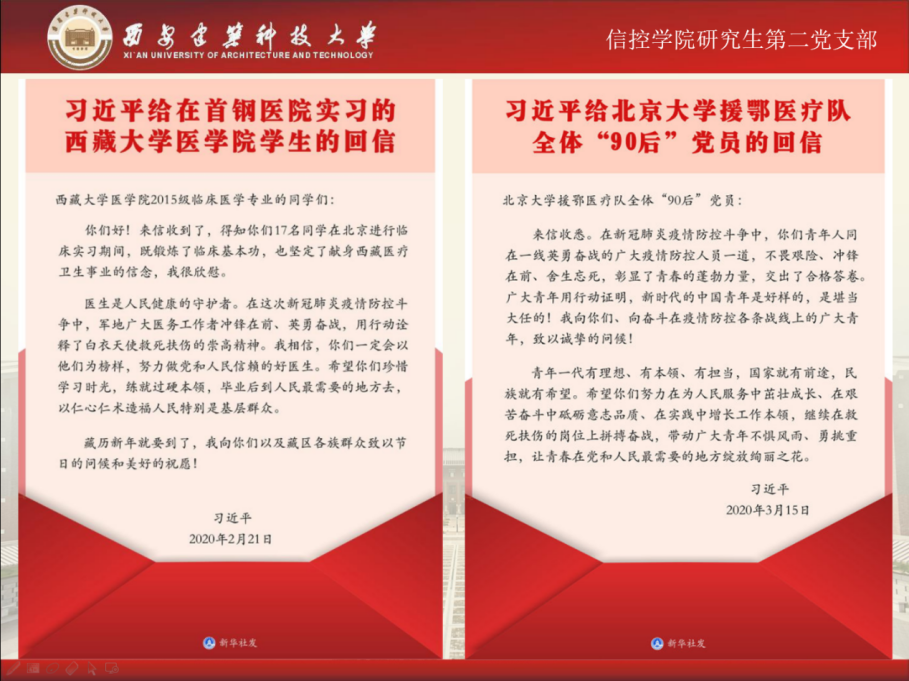 为学习习近平总书记给北京大学援鄂医疗队全体“90后”党员的回信精神以及给首钢医院实习的西藏大学医学院学生的回信精神,做好疫情期间学生党员思想政治教育,充分发挥基层党组织战斗堡垒作用,做好“停课不停学”,中国P站
