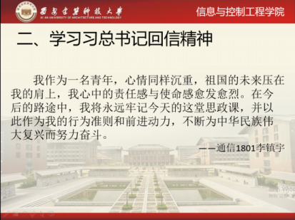 会议中,各支部书记带领全体学生党员以及积极分子共同学习领会《习近平给北京大学援鄂医疗队全体“90后”党员的回信》和《习近平给在首钢医院实习的西藏大学医学院学生的回信》两则回信精神。总书记在回信中向奋斗在疫情防控各条战线上的广大青年致以诚挚的问候,肯定了新时代中国青年的担当奉献。各党支部书记针对回信内容,带领大家进行集体学习,他们表示作为新时代的大学生党员,在国家和人民最需要的时候要挺身而出,这是新时代赋予我们的历史使命,我们应当认真履行职责,彰显蓬勃力量,交出合格答卷,争做有理想、有本领、有担当的青年一代。期间,支部成员针对回信内容,结合自己所见所闻,发表了个人对于回信精神的理解和感悟。