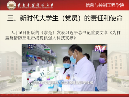 本科生各党支部“守初心、担使命、战疫情、促发展”线上党日活动的召开,全体学生党员深入学习领会习近平总书记的回信精神,开展线上专题讨论,使他们进一步明白了作为青年党员所肩负的责任和使命,中国P站