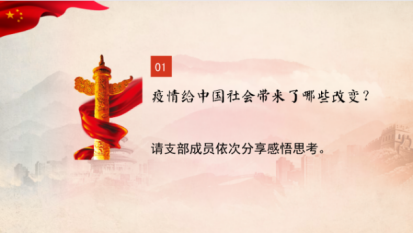 除此之外,各支部还结合本支部特点,开展相应的专题讨论。本科生第一党支部书记张雨明就“疫情给中国社会带来了哪些改变”这一问题展开讨论,支部成员从疫情期间国家的物资保障、信息共享以及各地在抗疫一线奋斗的基层党组织等方面展开交流。他强调,在疫情防控中,基层党组织和广大党员是非常重要的“硬核”力量,在组织群众、动员群众、宣传群众、实施联防联控、群防群控等方面,发挥着不可替代、至关重要的作用。