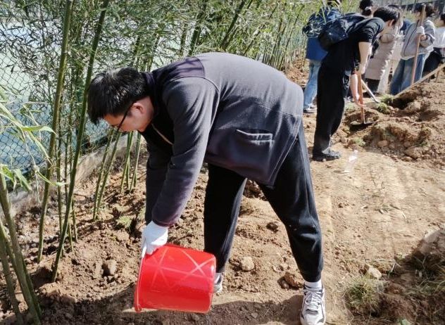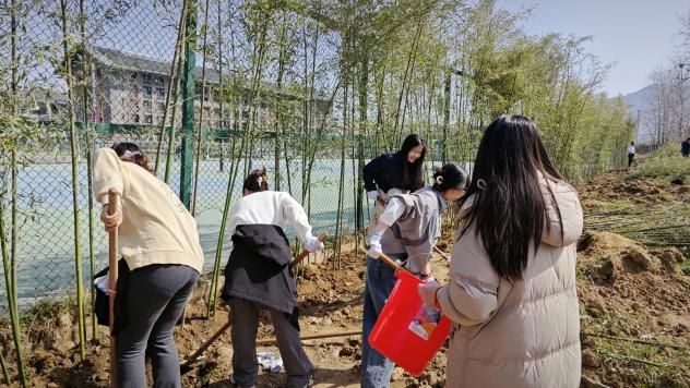 3月20日,“信”语心坊辅导站老师,研究生会,学生会负责人带领20余名研究生同学前往网球场南侧,开展“竹韵悠长,绿动未来”植树活动。“挖坑、填土、浇水,每一步都需要专注和耐心。”研究生毕业年级学生在竹苗前俯身劳作,额头的汗珠折射着春日阳光。作为科研攻坚阶段的研三学生近期面临论文收尾与就业的双重压力,大家纷纷表示“实验室的数据有时让人焦虑,但握着铁锹接触泥土时,感觉内心平静了许多。”信”语心坊辅导站杨老师介绍:“竹子象征着坚韧不拔的品格,种植过程能培养学生的责任感与专注力。我们希望通过生态美育,让科研压力在自然劳动中得到释放。”
