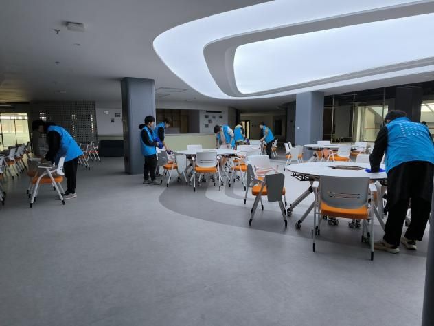 3月22日,“信”语心坊辅导站朋辈心理辅导员郝咏棋带领大一学生打扫紫阁食堂三楼。擦桌子、扫灰尘、拖地,同学们在劳动中释放压力,并表示:“擦桌子时要顺着木纹方向,就像梳理杂乱的思绪。盯着错题时总感觉大脑像蒙了层灰,现在擦净了桌子,心里也透亮了。”2小时的劳动,最终整个广场焕然一新。朋辈心理辅导员郝咏棋表示,这种 “身体劳动 + 情绪表达”的创新形式,吸引了众多低年级学生参与。