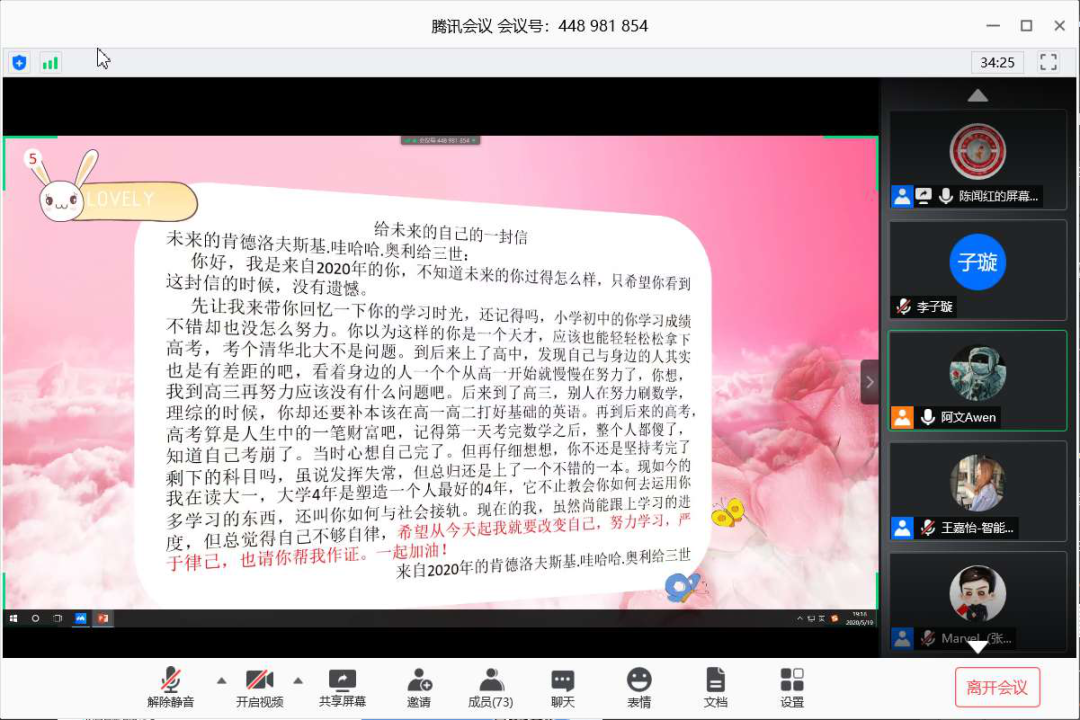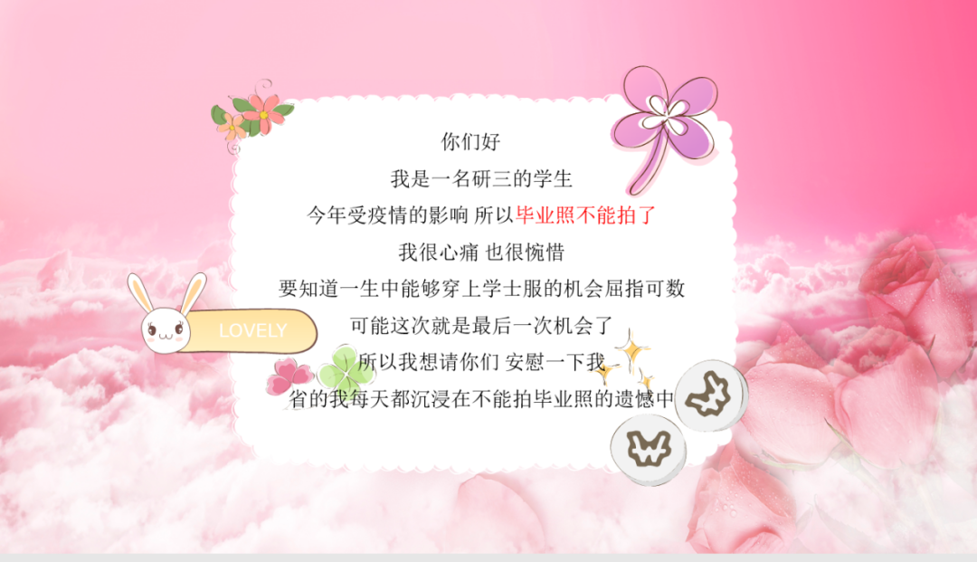 第二部分,在“那些来不及完成的事”中,同学表达了自己受疫情影响而不能拍毕业照的遗憾。期间所有人集思广益,为如何弥补出谋划策,回信的同学表示这会是一辈子印象最深刻的毕业照,并提出以线上拼接毕业照的方式或者约定一年之后重返校园补拍毕业照弥补遗憾。主持人还提到,对于其他既定已经逝去的事实,遗憾也是生活的一部分,不妨笑着去接纳,也许这点小小遗憾也是自我成长中必经的小确幸。