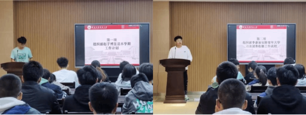 团委组织部李嘉如对团费收缴工作进行了说明,并且希望各团支部结合支部特点,策划并开展内涵丰富、效果显著的思想引领活动。素拓部李佳臻对本学期“第二课堂”成绩单以及课外素质学分认定、社会实践及志愿服务活动细则进行讲解,并向大家强调课外素质学分的重要性,鼓励大家积极参加各类课外实践活动。