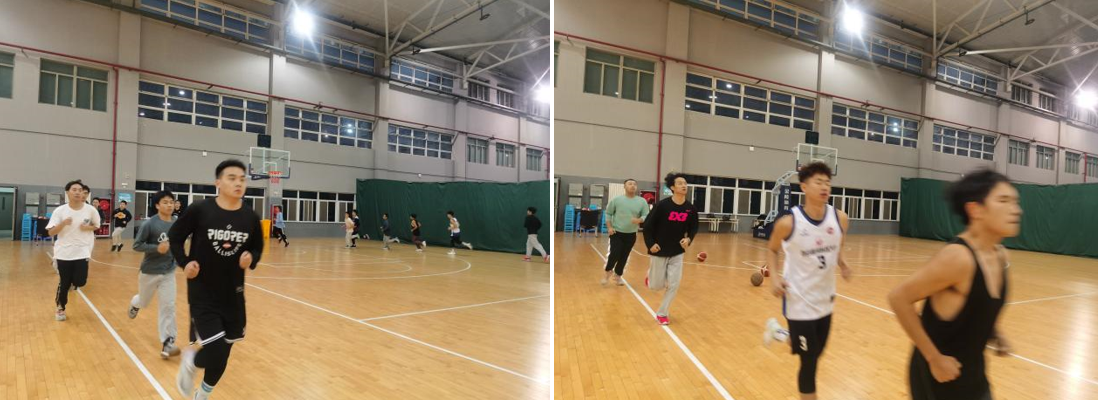 在热身阶段,教练安排球员们进行了绕篮球场热身五圈跑,s形冲刺跑圈、单人变向绕桩运球上篮等训练,为后续有针对性的训练打下基础,并辅以体能锻炼,进一步提高球员们的身体素质。