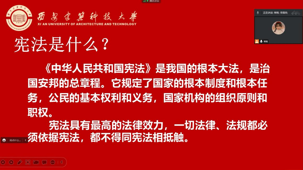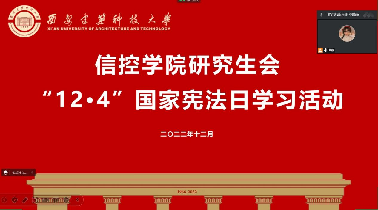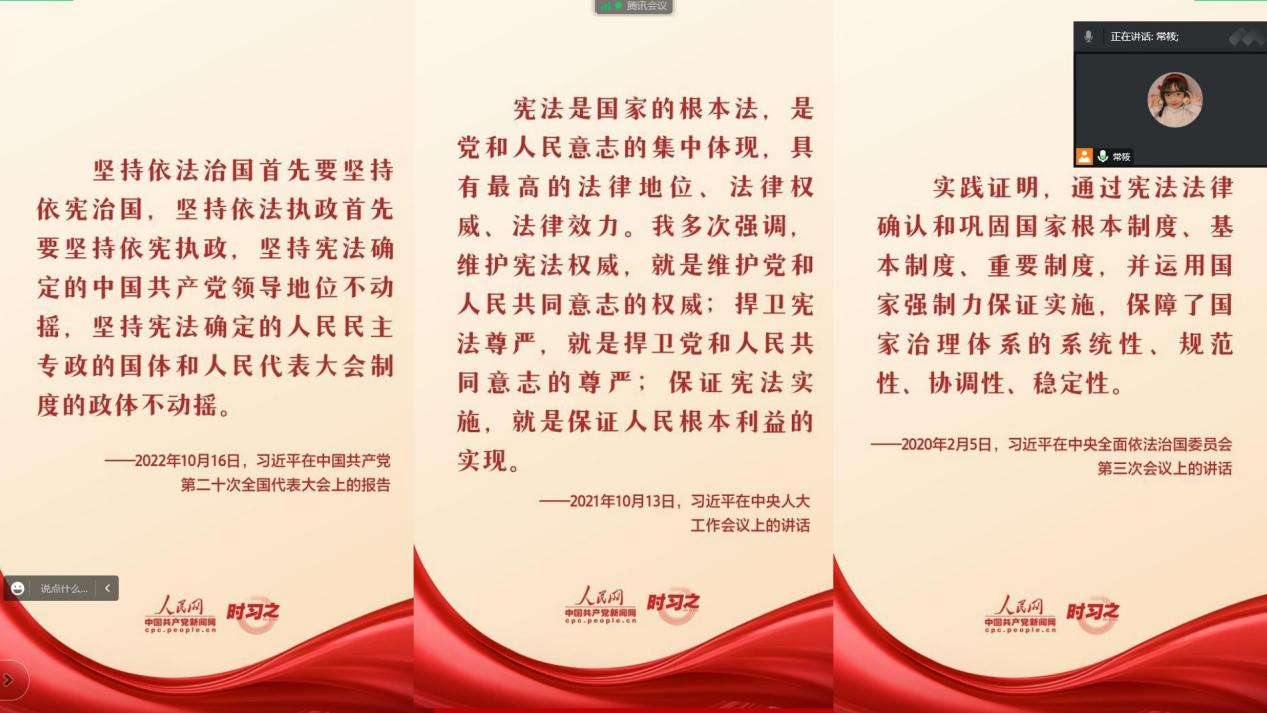 会议伊始,常筱同学围绕“学习宣传贯彻党的二十大精神,推动全面贯彻实施宪法”的宪法宣传周主题,以现行宪法公布施行四十周年为重点,对《宪法》进行了解读,带领大家回顾了宪法的发展历程和设立宪法日的目的和意义,让大家对宪法的发展、地位、重要性有了更深的理解和感悟。