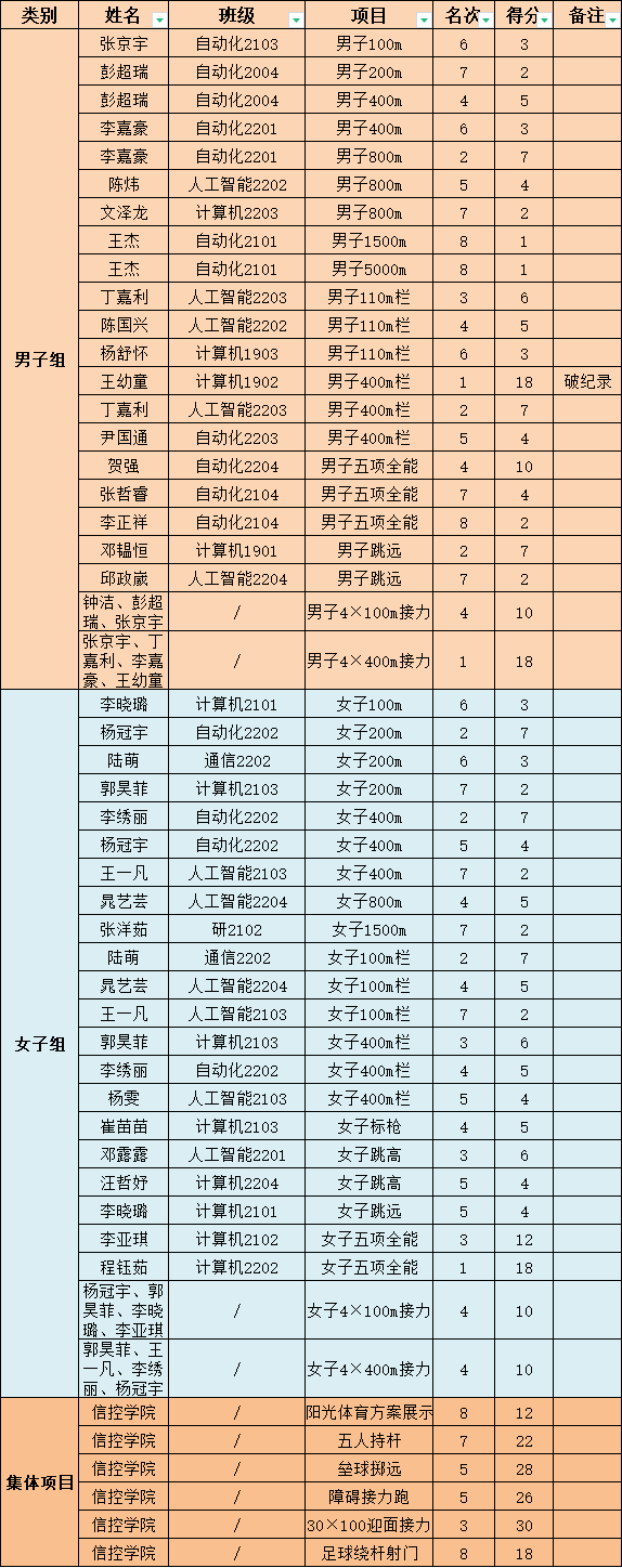 在此次比赛中,信控体育健儿发扬迎难而上、敢为人先、团结拼搏、自强超越的“体育运动红旗院”精神,不畏困难、敢打敢拼,在校第59届运动会中荣获学生女子团体第3名、学生男子团体第4名、学生男女团体第4名的优异成绩!其中,运动员王幼童在学生男子甲组400米栏项目中以1:00.4的成绩打破了其在2021年创造的1:01.6校运动会记录!