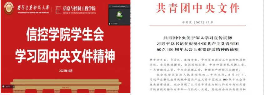 学生会开展线上会议学习了共青团中央文件《关于深入学习宣传贯彻习近平总书记在庆祝中国共产主义青年团成立100周年大会上重要讲话精神的通知》,我们要坚定不移听党话,跟党走,勇当先锋,牢记习近平总书记讲话精神,立志做有理想、敢担当、能吃苦、肯奋斗的新时代好青年。共青团要用习近平新时代中国特色社会主义 思想武装青年, 用新时代 10 年的伟大成就鼓舞青年, 用实现第 二个百年奋斗目标的宏伟蓝图激励青年, 引领广大团员青年深刻 领悟 “两个确立冶 的决定性意义, 增强 “四个意识冶 、 坚定 “四 个自信冶 、 做到 “两个维护冶 , 为全面建设社会主义现代化国家、 全面推进中华民族伟大复兴而团结奋斗。