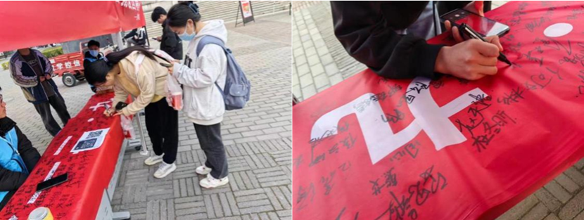 学生会、研究生会还在现场设置了签名横幅。88年前,青年学生们举着横幅上街游行,现如今,我们在红色的横幅上留下新的姓名,这是对爱国精神的一份承诺,更是对一二·九精神的一种传承。