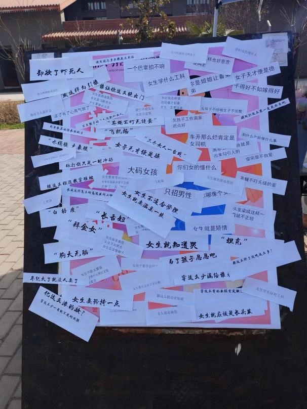 学生会成员在校园的各个角落贴上鲜花和赞美女性力量的话语,让同学们去寻找并感受温暖和鼓励。同时,设置了针对三八妇女节相关问题的答题活动,通过关于女性历史、成就和挑战的知识问答,向同学们传达对于女性的尊重与理解。更重要的是,我们设置了板子上贴有评价女性的负面标签,让同学们亲自撕下来,呼吁大家一起为女性正名。