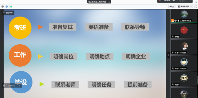 ,帮助学生增强责任意识和防护意识,加强学生教育引导和心理关怀,做好学生情况摸排管理,确保疫情期间信息畅通,努力引导学生做到安全健康和学习成材两不误。主题班会中,各班同学向班主任汇报了近期的学习、生活、志愿服务等情况,班主任们立足本班学生特点和年级工作重点,分别在基础知识学习、竞赛能力提升、考研规划引导、复试、就业准备等方面创造性开展日记打卡、笔记线上分享、竞赛手册汇编等工作安排。