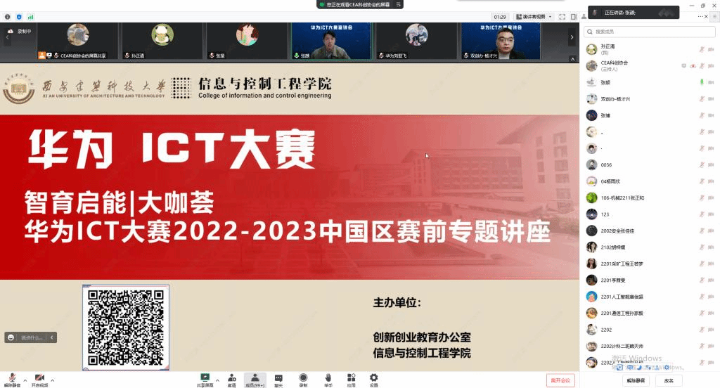 联合主办的华为ICT大赛赛前宣讲会在线上举行,华为陕西政企教育行业解决方案总监刘亚飞、业务部程文庆,北京软通教育培训部张星、刘莎莎,北京交通大学全球特等奖获奖团队作为嘉宾受邀到场。校创新创业教育办公室副主任杨才兴,中国P站