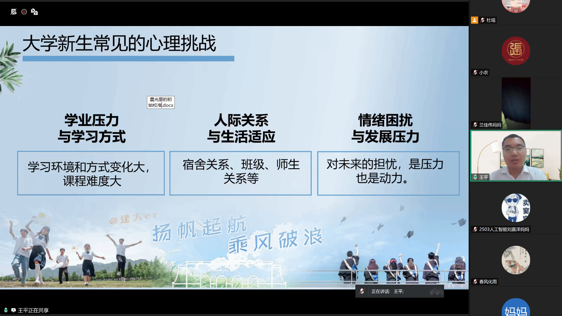 王平针对大学生心理健康教育工作进行专题讲解。他结合当代大学生常见的心理适应问题,分析了新生入学后可能面临的环境适应、人际关系、学业压力等心理挑战,介绍了学校心理素质拓展与咨询中心的服务内容、预约方式及危机干预机制,引导家长正确看待学生心理问题,鼓励家长与学校携手,共同为学生营造积极健康的心理成长环境。