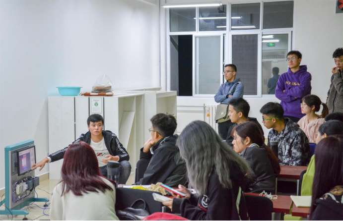 紧接着,他又从初赛赛项背景、初赛设备、初赛赛题、竞赛工程任务要求、备赛参考书籍、初赛和决赛的竞赛规则和流程等方面对比赛做了简单介绍。他说道,本赛项初赛以电梯行业为背景,要求参赛选手按照现实工程项目的实施流程来完成对电梯的控制。这不仅能提高学生的逻辑思维能力,还可以培养学生综合应用所学知识、分析、处理复杂环境下控制科学与工程相关领域现实问题的能力,提高学生对社会和环境变迁以及危机和突发事件的适应能力。最后,他在设备上进行了电梯仿真演示,做了相关说明,并强调了注意点。在过程中,同学们积极提出问题,他也一一耐心解答。