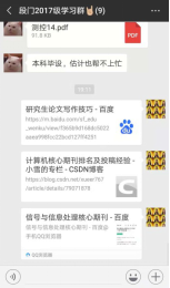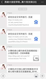 党员有行动,学术有创新。研究生第六党支部充分考虑支部外出党员实际情况,自11月20日起,组织支部成员依次轮流每天早上8点整定时在支部群内分享学术论文写作技巧、本专业论文顶级期刊、本专业学术论坛或峰会最新信息、本专业当前热点及难点等,并以党员为细胞,要求每位党员将支部分享内容分享至师门群,发挥党员带头作用,渗透至每位同学,营造学院整体学术氛围,提高全院同学科研能力。