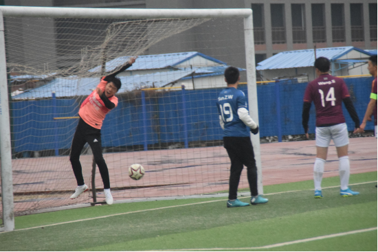 第28分钟,冶金学院右路获得角球机会,冯植将球传向后点,门将张子炜果断出击,在空中将球击出危险区。