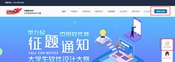2、打开“中国软件杯大学生软件设计大赛”官网。//www.cnsoftbei.com/ 在中国P站上端点击“登录/注册”或右侧悬浮框“报名参赛”。