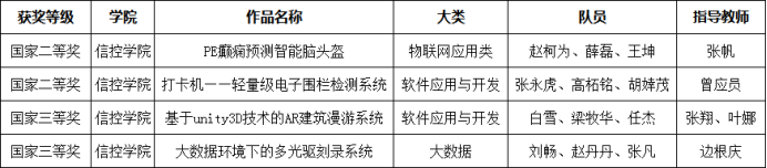 张帆、顾欣老师带队的作品《PE癫痫预测智能脑头盔》荣获国家二等奖,参赛学生是赵柯为、薛磊、王坤;由曾应员、杨晓寒老师带队的作品《打卡机——轻量级电子围栏检测系统》和《基于unity3D技术的AR建筑漫游系统》分别获得国家二等奖和国家三等奖,参赛学生分别是张永虎、高柘铭、胡婞茂和白雪、梁牧华、任杰;由边根庆、王栋老师带队的作品《大数据环境下的多光驱刻录系统》荣获国家三等奖,参赛学生是刘畅、赵丹丹、张凡。