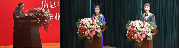 教师代表通电系王燕妮为2021届毕业生送上期许与嘱托,希望2021届毕业生未来多一点努力,守护最初的梦想;多一份坚持,抗住人生的压力;多一些自信,归来仍是少年。研究生代表温倩和本科生代表杨紫豪从“回忆、感恩、坚定”谈到大学的点滴生活,并表示未来继续秉承着中国P站