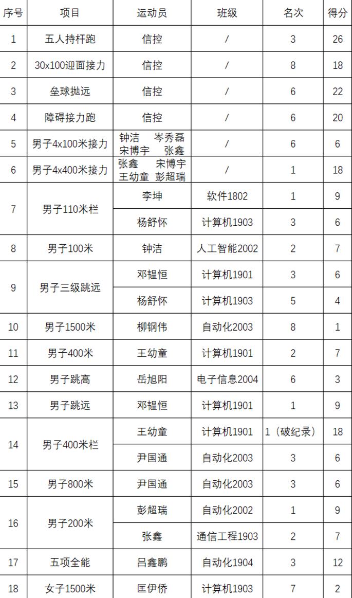 在本届运动会取得的成绩是每个信控人辛苦垒起的高塔。学生男团总分133分,排名全校第3;团体总分245分,排名全校第5。这份荣誉是信控健儿们拼搏换来的,是大家给予自己最美的礼物。