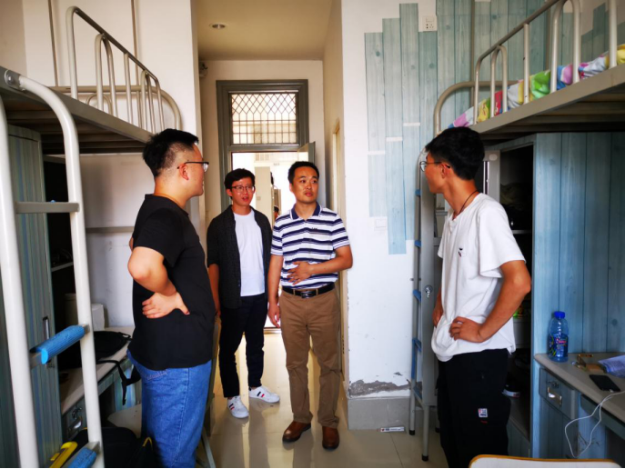 慰问小组一行人先后走访了新生入住的南山9#女生宿舍和南山11#男生宿舍。每到一个宿舍,两位老师都和大家亲切交谈,了解他们是否适应新环境。张博书记表示,学院会尽心尽力为同学们在草堂的学习生活提供良好的环境。同时,张博书记也对大家提出了三点期望:一是希望大家多和同学们沟通交流,尽快适应新环境,如果在学习、生活当中遇到问题及时向老师们寻求帮助;二是希望2019级的新同学能尽快适应研究生生活,更好地完成角色转变;三是希望同学们能好好利用研究生的时光,潜心问道,虚心求教,不辜负光阴。
