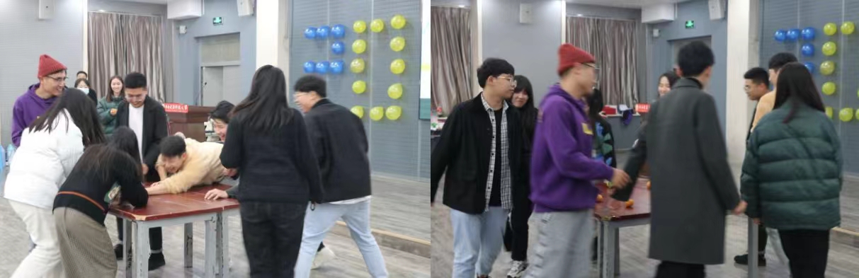 最后一个游戏是比比谁手快,现场随机抽取了八位同学,当音乐停止后去抢桌子上放置的七个橘子,伴随着欢快的音乐,大家转起了圈,在经历了七轮游戏后,最后的优胜者决出,获得了小礼物。