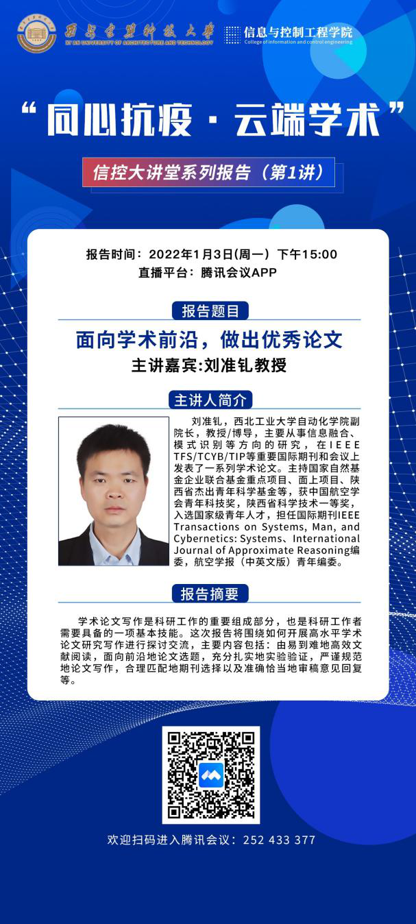 利用线上平台积极开展信控大讲堂系列学术活动。1月3日,学院特邀西北工业大学自动化学院副院长刘准钆教授作了题为“面对学术前沿,做出优秀论文”的学术报告。学院百余名师生线上参加,报告会由院长马宗方主持。
