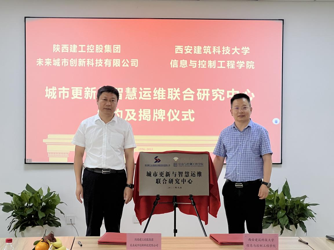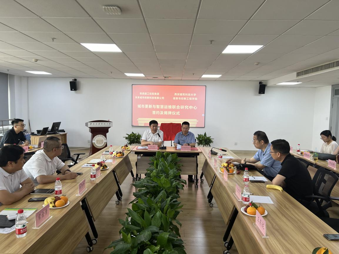 与陕西建工未来城市创新科技有限公司在工科楼713会议室举行城市更新与智慧运维联合研究中心揭牌仪式。陕建科技公司总经理田鹏刚,国际教育学院常务副院长、自动化专业负责人段中兴,计算机学科负责人李昌华及学院教师代表参加。